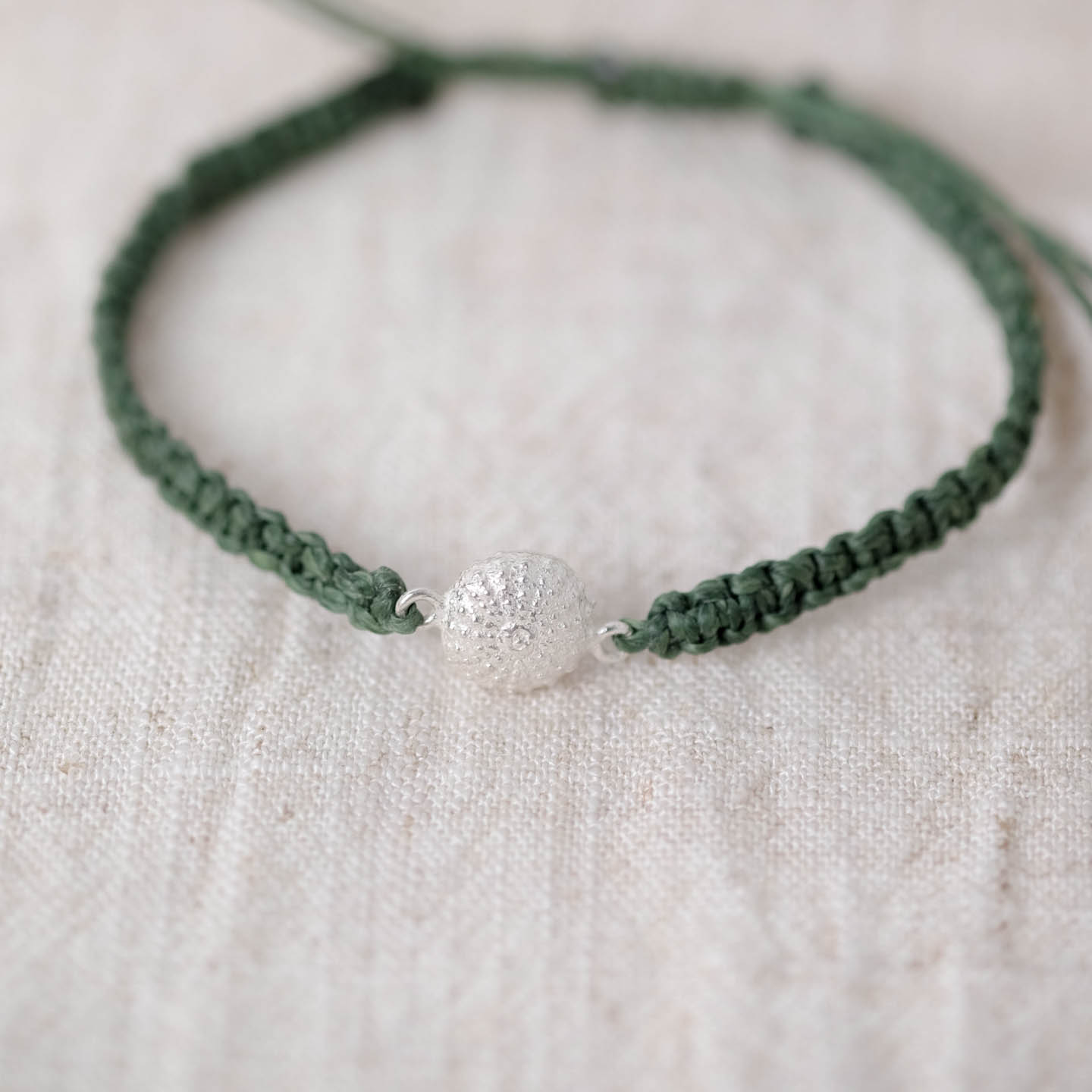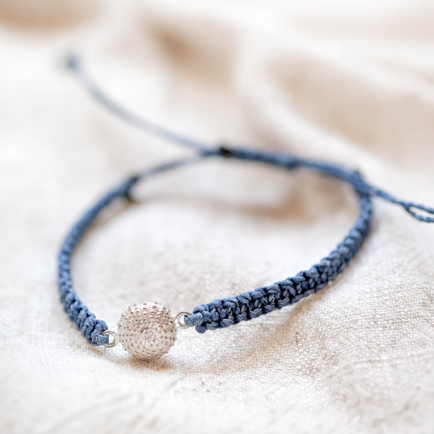 The Sea Urchin macrame bracelet is the ideal accessory to wear all summer long. The sea urchin measures 1 cm in diameter. We have different finishes, shiny or oxidized silver. Each bracelet is made in sterling silver, handmade in our workshop in Mahon in Menorca.